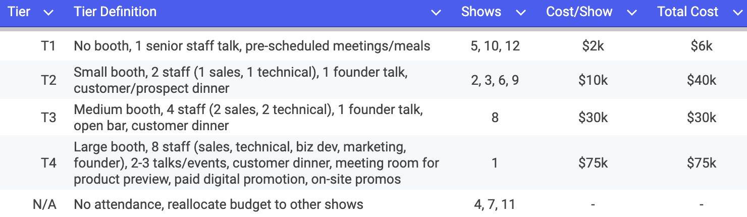 To do this, start with a shortlist of shows and present a tiering rubric to help quickly align on an overall approach. For example, let’s say you’re going to 12 shows on a tight budget. After a team discussion, your shows in tiers 1-4 might look like Figure 1.1 below.
